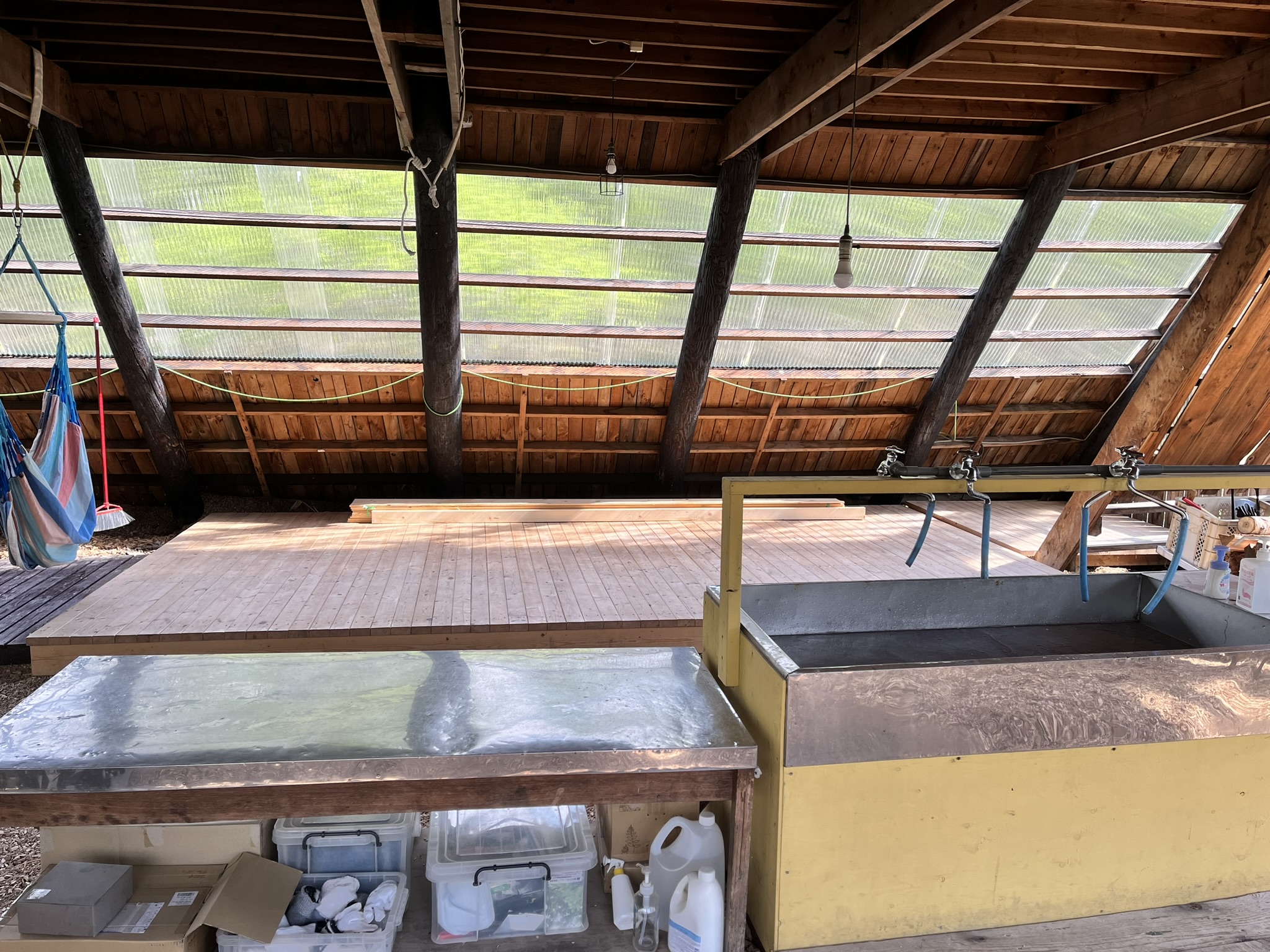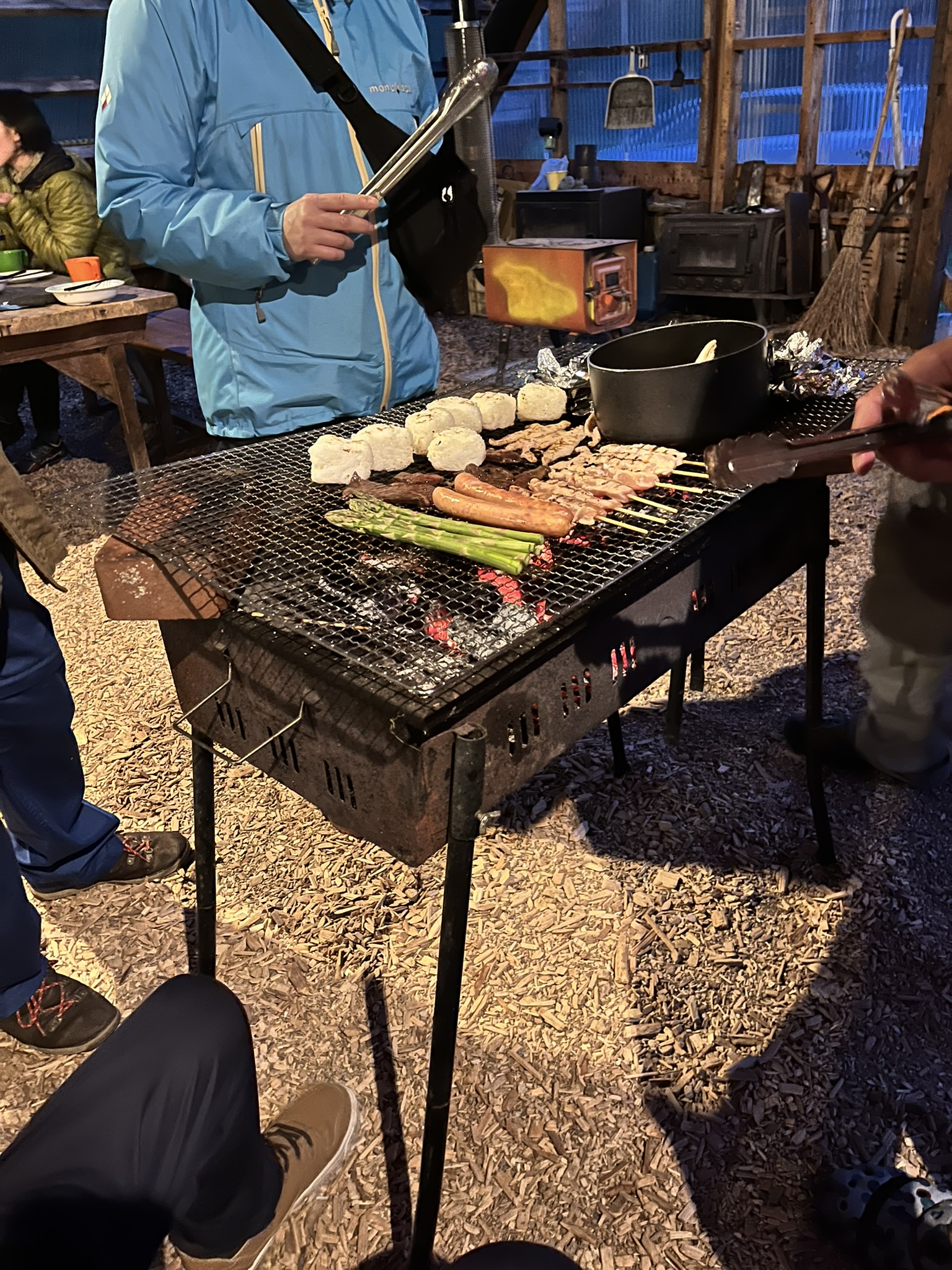 ▲自炊棟の中は使いやすい土間になってます。雨天も焼肉OK!流しでは合成洗剤を控えて、備え付けの石鹸を使ってください。ゴミの持ち帰りにご協力ください。