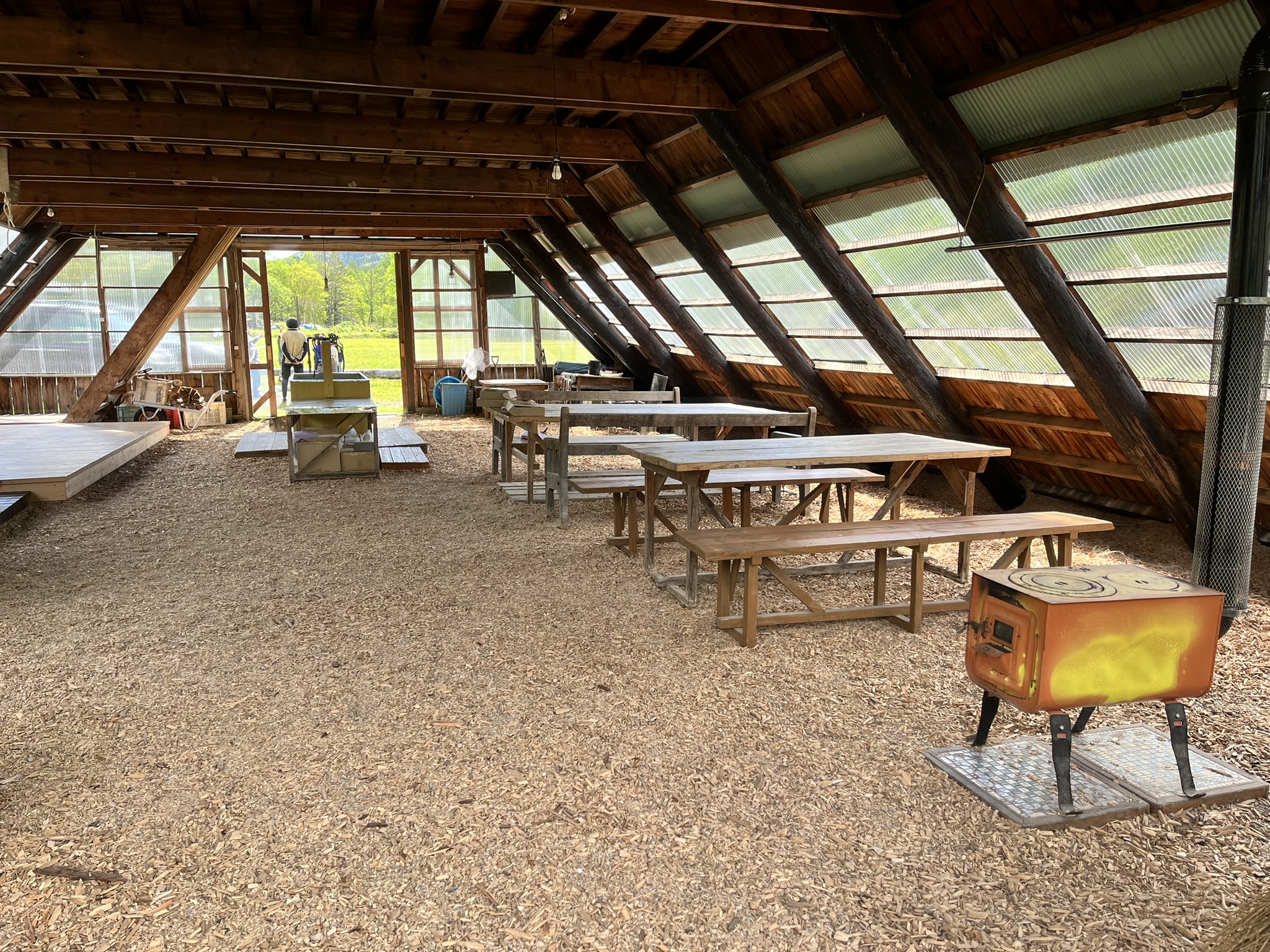 とても大きな大きな丸太小屋です。まずはその大きさに驚いてください。1階はキッチンと食堂、事務所。2、3階はスタッフの部屋です。冬暖かく、夏涼しい母屋です。
